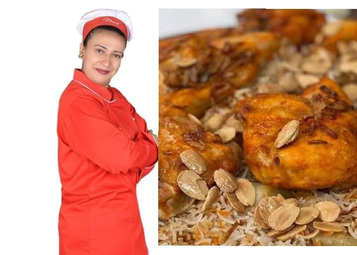 بعد السلق نوضع الأرز فى الإناء الموجود فيه البطاطس والزبادى والجنزبيل والثوم ويوزع الرز جيدا فى الإناء ويضغط عليه بهدوء ونوزع عليه خليط الزعفران بماء الورد او خليط الزعفران بالزبده ثم نجيب قطعه سلفر صغيره توضع على الأرز ويوضع فوقيها قطعه فحم ننزل عليها يقطعه الذبده وتغلق جيدا بالغطاء لتأخذ ريحه الفحم وبعد التسويه نغرف الرز فى طبق التقديم ونرش المكسرات ثم نرص الفراخ فوق الرز وبالهنااا والشفااا