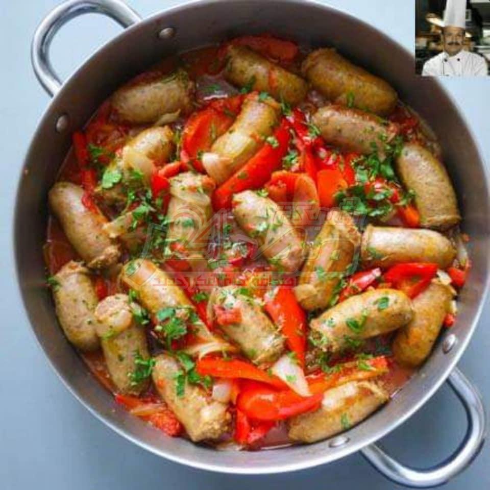 نرجع السجق مرة أخرى في المقلاة مع البصل والفلفل.