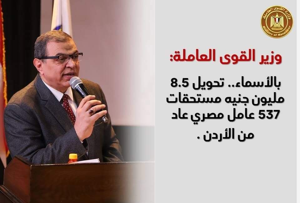 أعلن وزير القوى العاملة، محمد سعفان، أن مكتب التمثيل العمالي التابع للوزارة بالسفارة المصرية بعمان-الأردن، استطاع بالمتابعة اللحظية والجهود المبذولة والمقابلات مع المسئولين بمؤسسة الضمان الاجتماعي بالأردن، واستكمالا لما تم تحويله سابقا، تم تحويل القائمة الـ 32 من مستحقات الضمان الاجتماعي لنحو 537 عامل مصري لدى المؤسسة غادروا عمان نهائيا.
