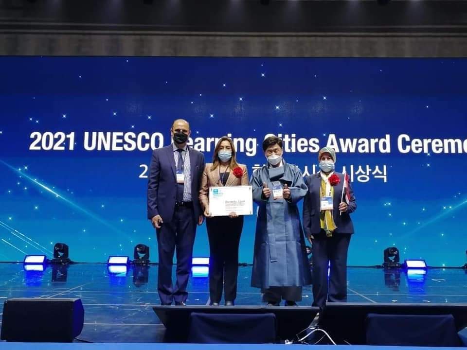 شارك د. حازم فهمي، سفير جمهورية مصر العربية في كوريا الجنوبية، في حفل تسليم جوائز المؤتمر الدولي الخامس لمنظمة الأمم المتحدة للثقافة والعلوم والتعليم (اليونسكو) لمدن التعلم 2021، والذي حضرته د. منال عوض، محافظ دمياط، بمناسبة اختيار مدينة دمياط ضمن المدن العشر الفائزة بالجائزة الدولية لعام 2021، والتي تمُنح لأفضل عشر مدن على مستوى العالم في مجال تقديم فرص فريدة للتعلم لمختلف فئات المواطنين القاطنين بها من حيث المفهوم الشامل للتعليم، والذي يتضمن إكساب مهارات تنمية القدرات البشرية للارتقاء بالمستوي المعيشي وخلق فرص لحياة كريمة.