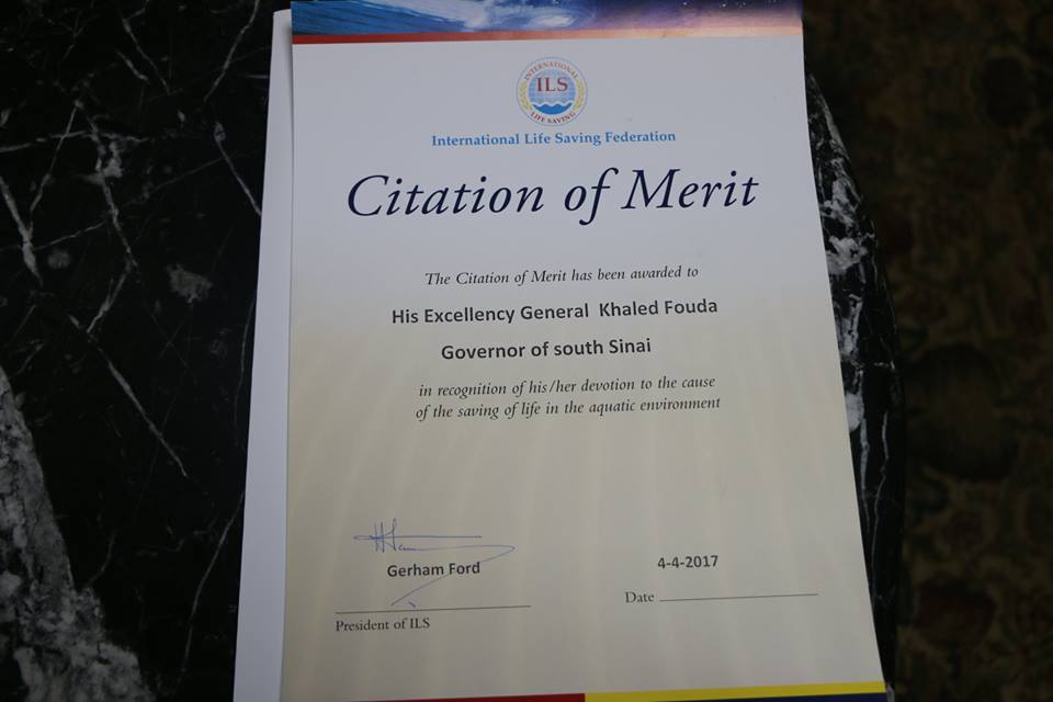 حيث قدم رئيس الإتحاد وسام الشجاعه والإقدام لدوره ومجهوداته في دعم رياضة الغوص والإنقاذ، ولتعاونه مع الإتحاد الدولي، كما طلب رئيس الإتحاد تخصيص مساحه من الأرض لاقامه أكاديميه للانقاذ والغوص بشرم الشيخ لاعداد المدربين والمتدربين،مشيرا الي وفاة مليون و200 ألف شخص يموتوا غرقا سنويا على مستوي العالم، بمعدل 2 شخص كل دقيقه مما يعتبر خساره فادحه في الارواح وخسارة ماديه ايضا للدول.