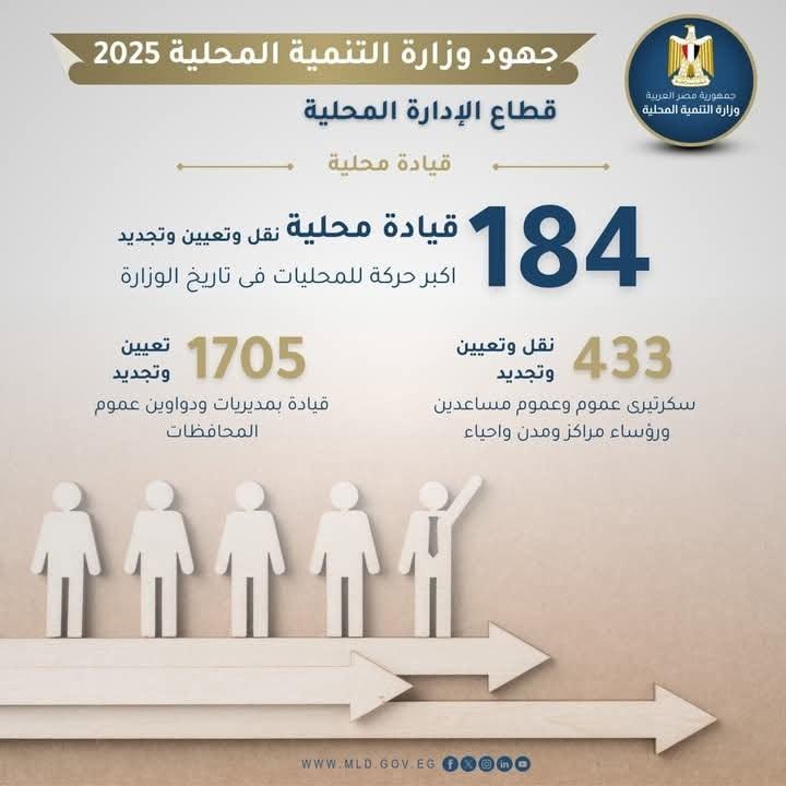 قامت الوزارة خلال عام 2025 بمتابعة وإدارة حركة القيادات بالإدارات المحلية والدواوين ومديريات الخدمات بالتنسيق مع الجهات المعنية والمحافظين، لضمان وجود قيادات كفؤة تنفذ خطط التنمية المحلية بفاعلية.