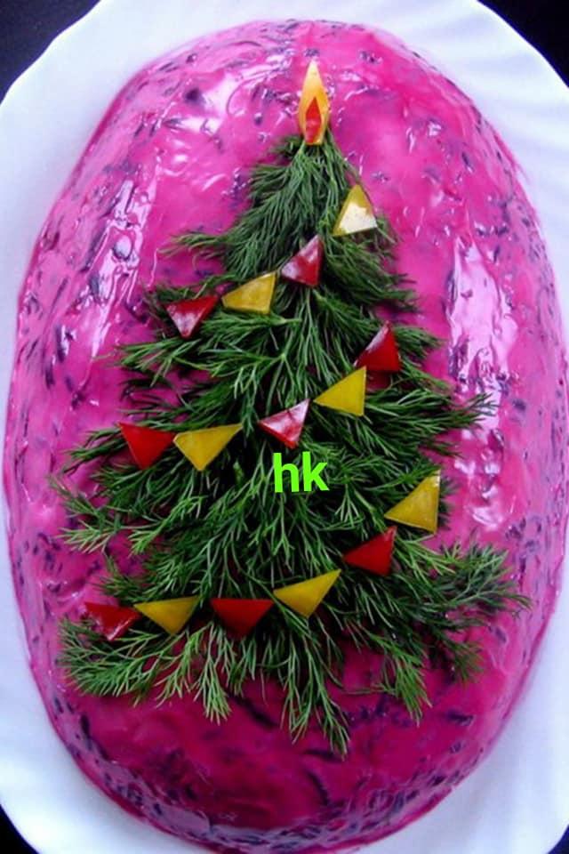 يقشر البنجرثم نقوم بهرس البنجر، جيدا ثم يقلب معه خليط الزبادي، ويضاف المزيد من الملح والفلفل الأسود حسب الرغبة.ثم يوضع فى طبق التقديم ثم يضاف الشبت على شكل الشجرة والفلفل الالوان للزينة ويصبح شجر الكريسماس
