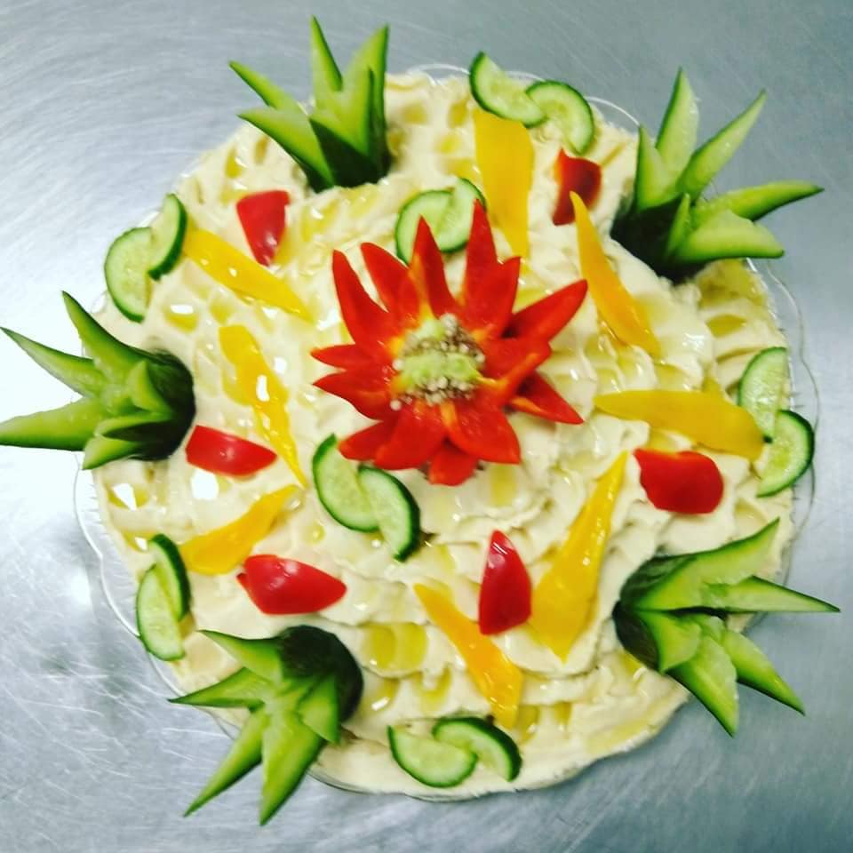 نضع كل المكونات على بعض وتوضع فى صينية التشيز كيك ويتم تشكيلها على شكل تورتة وتزين بالخيار والفلفل الالوان وتقدم فى العزومات والحفلات والمناسبات الخاصة