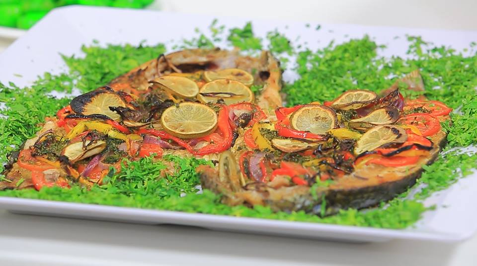 ينظف السمك من الزعانف والقشور ثم تفتح من الظهر ونخرج الاحشاء الداخلية وتغسل جيدا ثم نرش عليه قليل من الملح والليمون قليل من الزيت تخلط كل المكونات السابق ذكرها في وعاء ويوضع عليه الملح والكمون وتقلب جيدا وتجهز صينية وتفرش بنصف كمية الحشو ويرش عليه قليل من الزيت ثم يرص السمك ويوضع الحشو المتبقى فوق السمك بطريقة متناسقة ويرش فوقه قليل من الزيت وشرائح الليمون وتوضع في فرن متوسط الحرارة حتى تنضج