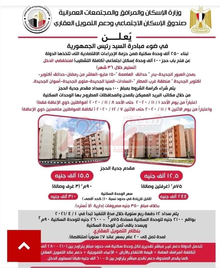 «الإسكان» تفتح باب الحجز لـ100 ألف شقة بالمشروع...