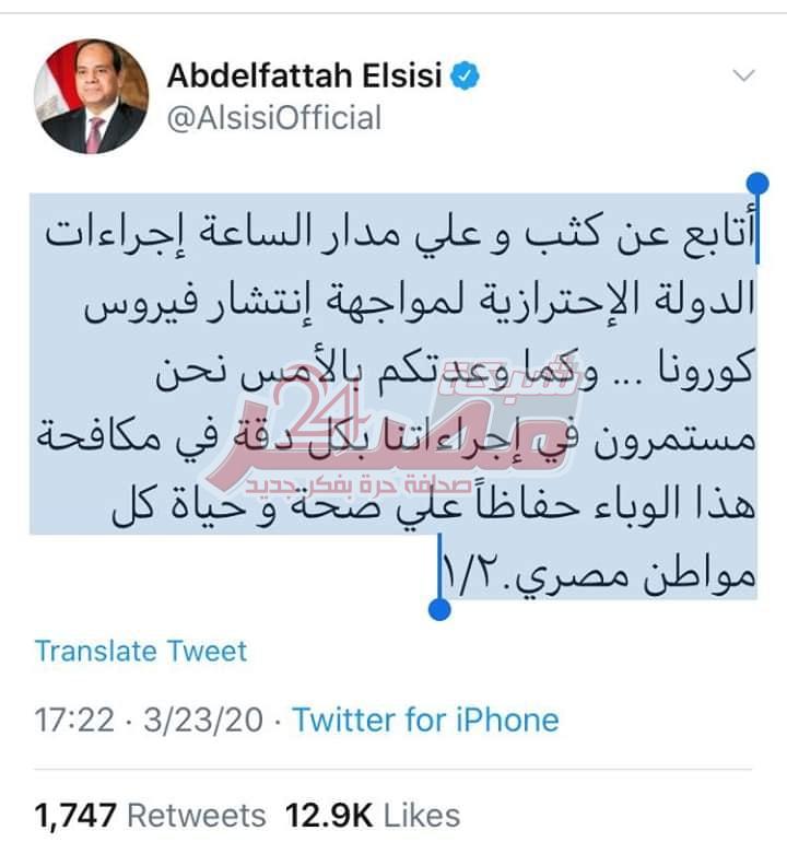 الرئيس السيسي يُغرد عبر تويتر: بشأن فيرس كورونا