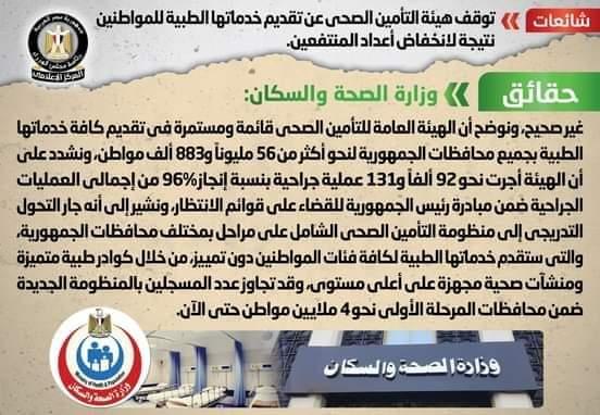 تداولت بعض المواقع الإلكترونية وصفحات التواصل الاجتماعي أنباء بشأن توقف هيئة التأمين الصحي عن تقديم خدماتها الطبية للمواطنين نتيجة لانخفاض أعداد المنتفعين، وقد قام المركز الإعلامي لمجلس الوزراء بالتواصل مع وزارة الصحة والسكان، والتي نفت تلك الأنباء، مُؤكدةً أنه لا صحة لتوقف هيئة التأمين الصحي عن تقديم خدماتها الطبية للمواطنين نتيجة لانخفاض أعداد المنتفعين، مُوضحةً أن الهيئة العامة للتأمين الصحي قائمة ومستمرة في تقديم كافة خدماتها الطبية بجميع محافظات الجمهورية لنحو أكثر من 56 مليوناً و883 ألف مواطن، مُشددةً على أن الهيئة أجرت نحو 92 ألفاً و131 عملية جراحية بنسبة إنجاز 96% من إجمالي العمليات الجراحية ضمن مبادرة رئيس الجمهورية للقضاء على قوائم الانتظار، مُشيرةً إلى أنه جار التحول التدريجي إلى منظومة التأمين الصحي الشامل على مراحل بمختلف محافظات الجمهورية، والتي ستقدم خدماتها الطبية لكافة فئات المواطنين دون تمييز، من خلال كوادر طبية متميزة ومنشآت صحية مجهزة على أعلى مستوى، وقد تجاوز عدد المسجلين بالمنظومة الجديدة ضمن محافظات المرحلة الأولى نحو 4 ملايين مواطن حتى الآن.