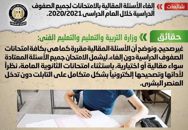 تردد في بعض وسائل الإعلام والمواقع الإلكترونية وصفحات التواصل الاجتماعي أنباء بشأن إلغاء الأسئلة المقالية بالامتحانات لجميع الصفوف الدراسية خلال العام الدراسي 2020/2021، وقد قام المركز الإعلامي لمجلس الوزراء بالتواصل مع وزارة التربية والتعليم والتعليم الفني، والتي نفت تلك الأنباء، مُؤكدةً أنه لا صحة لإلغاء الأسئلة المقالية بالامتحانات لجميع الصفوف الدراسية خلال العام الدراسي 2020/2021، مُوضحةً أن الأسئلة المقالية مقررة كما هي بكافة امتحانات الصفوف الدراسية دون إلغاء، ليشمل الامتحان جميع الأسئلة المعتادة سواء مقالية أو اختيارية، باستثناء امتحانات الثانوية العامة، نظراً لأدائها وتصحيحها إلكترونياً بشكل متكامل على التابلت دون تدخل العنصر البشري.