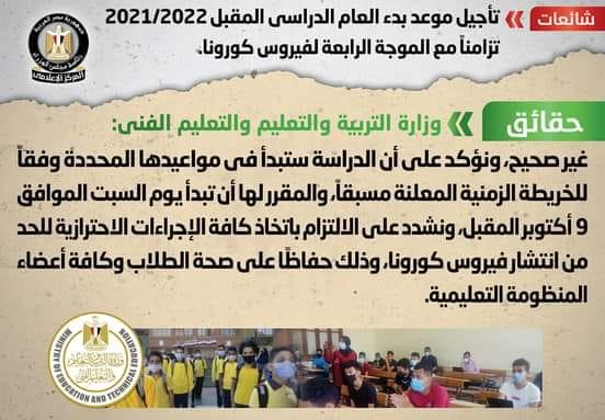 انتشر في بعض المواقع الإلكترونية وصفحات التواصل الاجتماعي أنباء بشأن تأجيل موعد بدء العام الدراسي المقبل 2021/2022 تزامناً مع الموجة الرابعة لفيروس كورونا، وقد قام المركز الإعلامي لمجلس الوزراء بالتواصل مع وزارة التربية والتعليم والتعليم الفني، والتي نفت تلك الأنباء، مُؤكدةً أنه لا صحة لتأجيل موعد بدء العام الدراسي المقبل 2021/2022 تزامناً مع الموجة الرابعة لفيروس كورونا، مُوضحةً أن الدراسة ستبدأ في مواعيدها المحددة وفقاً للخريطة الزمنية المعلنة مسبقاً، والمقرر لها أن تبدأ يوم السبت الموافق 9 أكتوبر المقبل، مُشددةً على الالتزام باتخاذ كافة الإجراءات الاحترازية للحد من انتشار فيروس كورونا، وذلك حفاظًا على صحة الطلاب وكافة أعضاء المنظومة التعليمية.