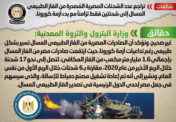انتشر في بعض المواقع الإلكترونية وصفحات التواصل الاجتماعي أنباء بشأن تراجع عدد الشحنات المصرية المُصدرة من الغاز الطبيعي المسال إلى شحنتين فقط تزامناً مع بدء أزمة كورونا، وقد قام المركز الإعلامي لمجلس الوزراء بالتواصل مع وزارة البترول والثروة المعدنية، والتي نفت تلك الأنباء، مُؤكدةً أنه لا صحة لتراجع عدد الشحنات المصرية المُصدرة من الغاز الطبيعي المسال إلى شحنتين فقط تزامناً مع بدء أزمة كورونا، مُوضحةً أن الصادرات المصرية من الغاز الطبيعي المسال تسير بشكل طبيعي رغم تداعيات أزمة كورونا، حيث ارتفعت صادرات مصر من الغاز المسال بإجمالي 1.6 مليار متر مكعب من الغاز المكافئ، لتصل إلى نحو 17 شحنة خلال الربع الأخير من عام 2020، مقارنة بـ 6 شحنات خلال الربع الأول من نفس العام، مُشيرةً إلى أنه تم إعادة تشغيل مصنع دمياط للإسالة، والذي سيسهم في جعل مصر إحدى الدول الرئيسية في تصدير الغاز الطبيعي المسال.