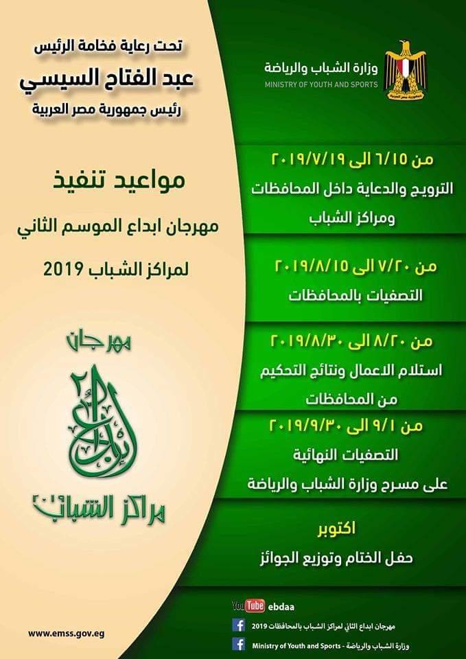 وتابع، محروس، ان المهرجان يتم علي عدة مراحل، اما المرحلة الأولي تبدأ من ١٥ يونيه وحتي ١٩ يوليو، وهي عبارة عن مرحلة الترويج والدعايا للمهرجان، والمرحلة الثانية من ٢٠ يوليه الي ١٥ أغسطس، للتصفيات علي مستوي المحافظة بين المتسابقين، اما المرحلة الثالثة من ٢٠ أغسطس وحتي ٣٠ أغسطس، وتتم بالوزارة وتشمل استلام الأعمال ونتائج التحكيم من المحافظات، اما المرحلة الرابعة من ١ سبتمبر الي ٣٠ سبتمبر وهي تضم التصفيات النهائية علي مسرح وزارة الشباب والرياضة، اما حفل وتوزيع الجوائز سيكون في شهر أكتوبر القادم.