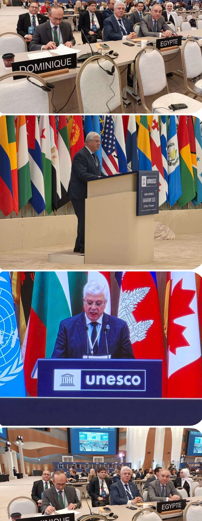 وأما في مجال الثقافة، أشار الوزير إلى أن مصر تواصل جهودها لتعزيز وصون التراث المادي وغير المادي، ومكافحة الاتجار غير المشروع بالممتلكات الثقافية، والمشاركة الفعالة في تنفيذ اتفاقيات اليونسكو الثقافية، مع التركيز على التعاون الدولي للتغلب على التحديات التي تواجه المنطقة العربية والإفريقية، وتنفيذ أولويات إفريقيا، مشيرًا إلى أنه مثل قرار الدورة 47 للجنة التراث العالمي رفع موقع التراث العالمي المصري "دير أبو مينا" من قائمة التراث المهدد بالخطر تتويجًا لجهود مصر والتعاون مع اليونسكو، كما يتطلع وفد مصر إلى اعتماد قرار إحياء اليوم العالمي للتراث الثقافي المغمور بالمياه؛ تقديرًا لقيمته الحضارية، كما أبرز الوزير افتتاح المتحف المصري الكبير غدًا، الأول من نوفمبر؛ باعتباره صرحًا ثقافيًا وحضاريًا فريدًا، وأكبر متحف في العالم مخصص لتاريخ الحضارة المصرية القديمة.