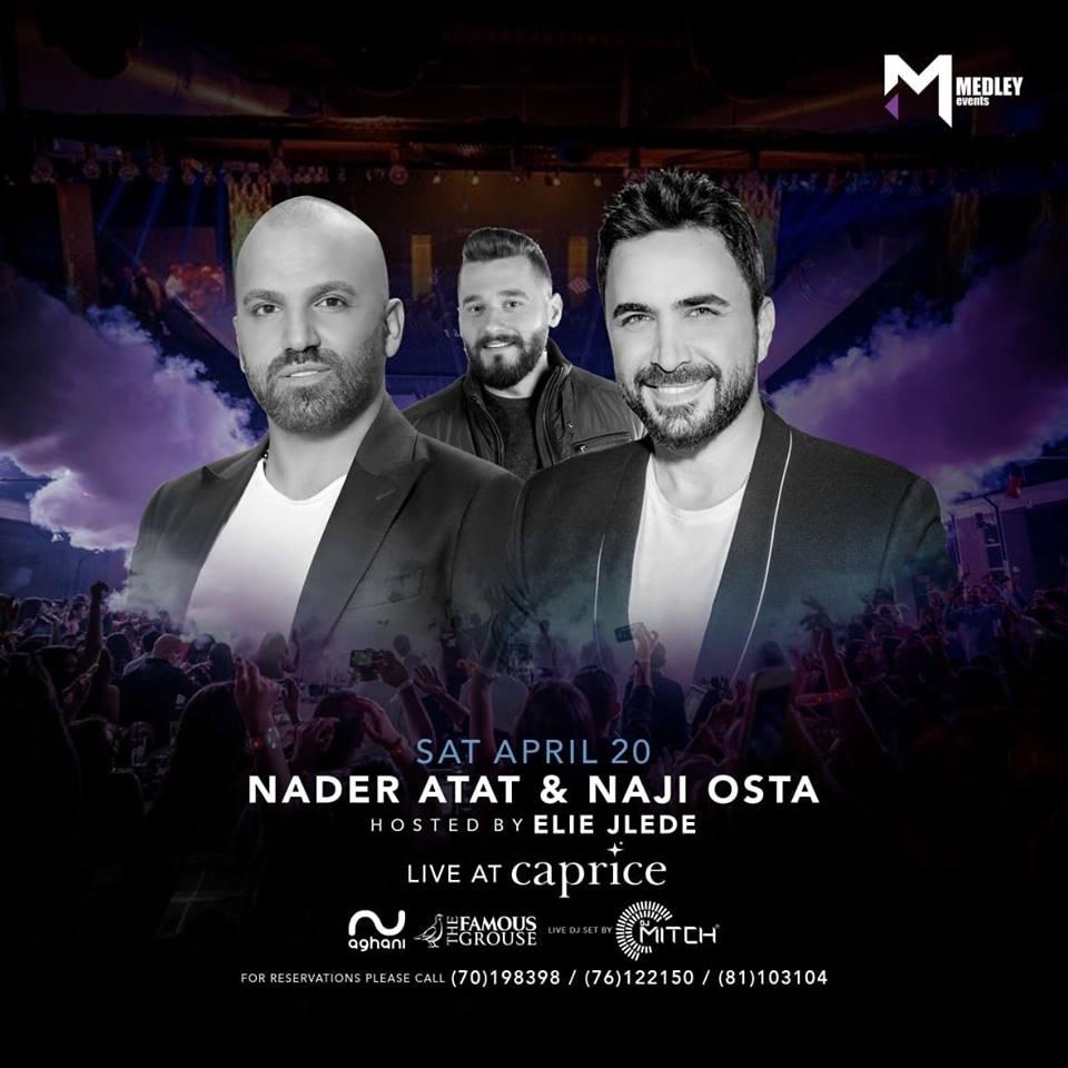 يحيي النجمان نادر الأتات وناجي الأسطا حفلًا غنائيًا في مطعم Caprice بيروت، وذلك يوم السبت الموافق 20 من أبريل الجاري.