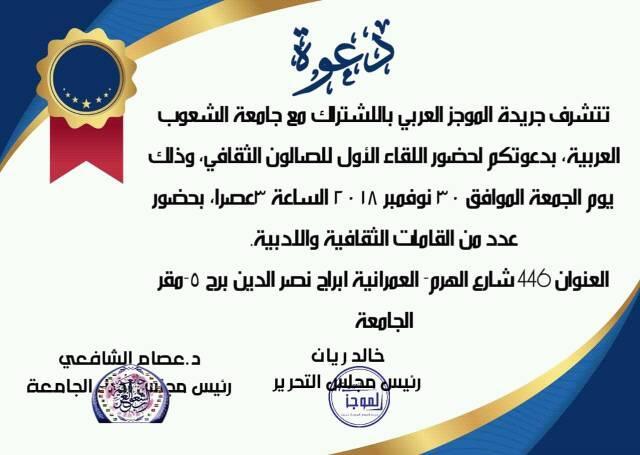 يشهد يوم ٣٠من نوفمبر الجاري انطلاق اولى لقاءات صالون الموجز العربي الثقافي والذي سيكون بالاشتراك ما بين جريدة الموجز العربي وجامعة الشعوب العربية..