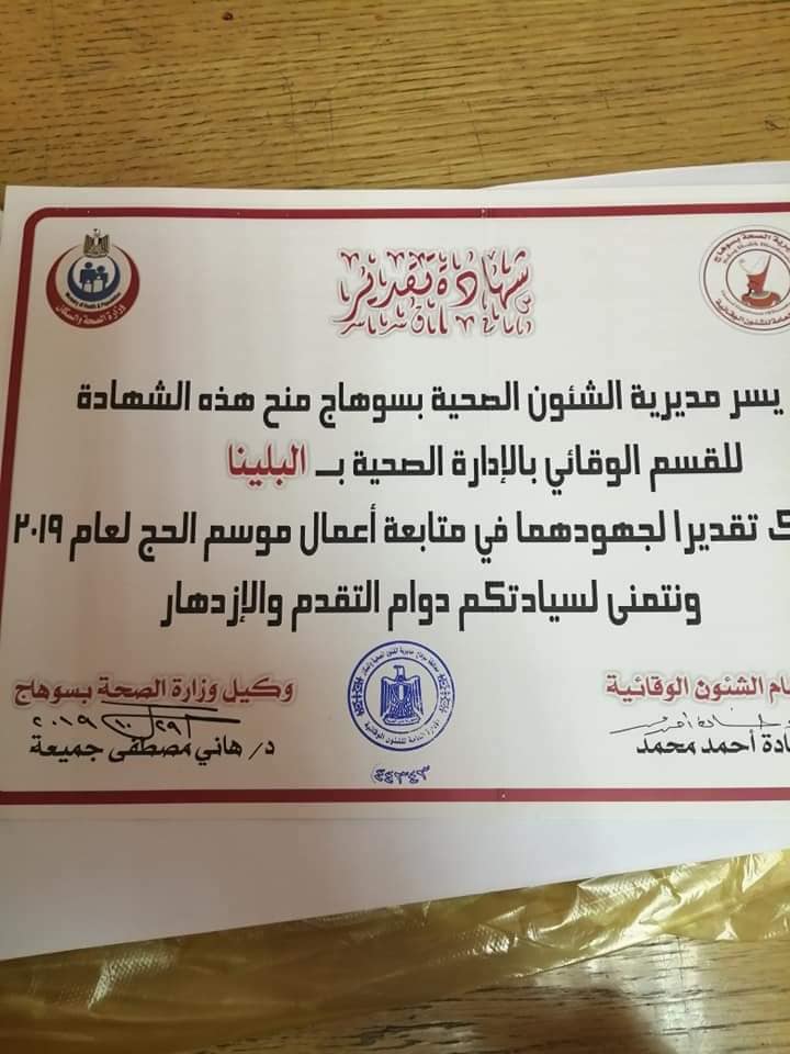 د. غادة احمد مديرعام الشئون الوقائية بمديرية الصحة بمناسبة انتهاء موسم متابعة الحجاج 2019 وتحقيق الادارة الصحية بالبلينا نسبة 100٪ في متابعة الحجاج، وفي نهاية التكريم أشاد وكيل وزارة الصحة بسوهاج مجهودات الدكتور النمر وفريق العمل لمجهوداتهم في النهوض بالادارة الصحية وقدم الشكر لقسم الوقائي