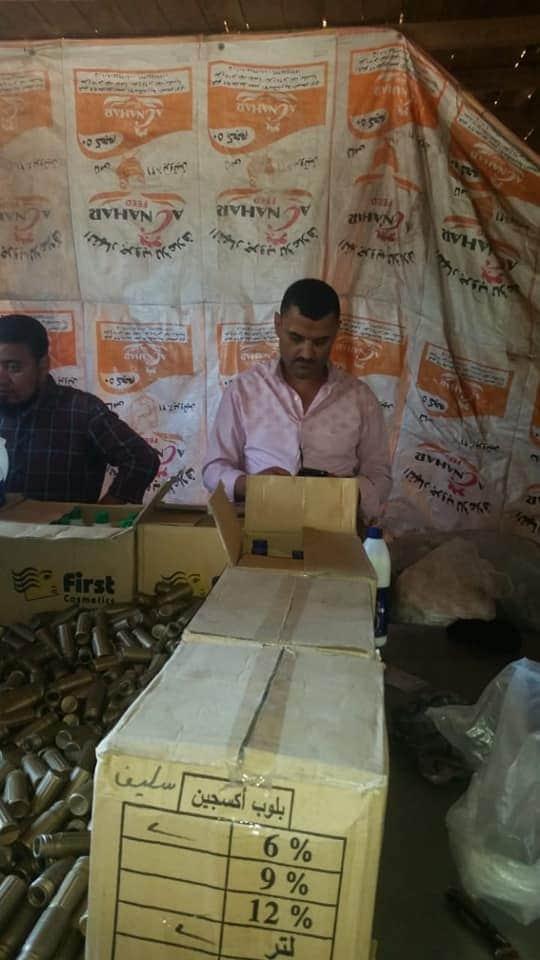 2برميل معباء حجاره سودا ماده خام لتصنيع الحنه زنه الواحد 25ك5000 فارغ زجاجات 10000 غطاء الزجاجات10000 فارغ كرتونه التي يعبيء فيها المنتج النهائي وتم اتخاذ الاجراءات القانونية اللازمة حيال تلك الواقعة
