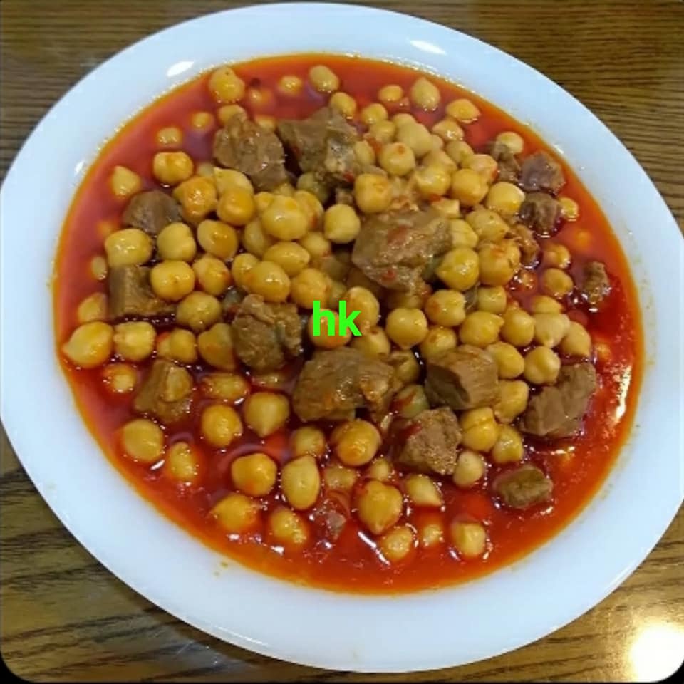 قبل أن يتغير لون البصل والثوم نضيف الطماطم والصلصة مع الخل والحمص المسلوق.