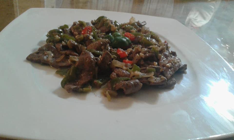 ثم أهدى النار وانزل بالكبده واقلبها واتركها حتى تجف من السوائل ثم اضع جميع التوابل المذكوره بمقدار نص ملعقه صغيره وثم اضع الثوم والبصل وأقلب كويس ثم الفلفل كله الرومى والحامى واقلبهم كويس ثم أرش ملح اقلب حتى تجف ثم بعد الانتهاء من طهيها ممكنتتعمل سندوتشات مع سلطة الطحينيه أو تقدم فى طبق بجوارها بطاطس محمره وبالهنا