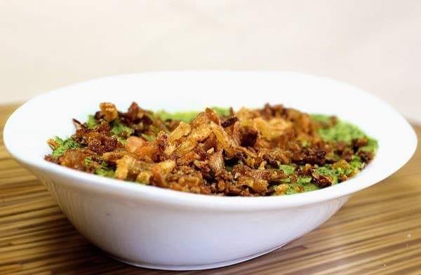 نحمي زيت الزيتون في مقلاة على نار متوسطة ونضيف البصل المفروم ونحرك حتى يصبح بنيا ثم نضيفه مع الثوم لهريس الملوخية والعدس مع قليل من الماء إذا كان المزيج سميكا جدا