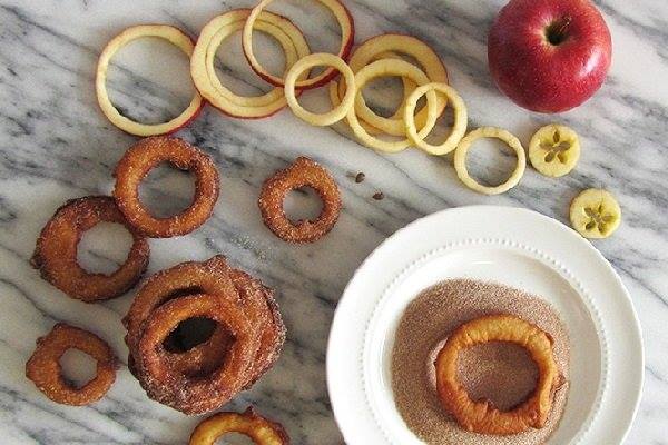 اغمسي حلقات التفاح في خليط اللبن والدقيق وتقلى في الزيت الساخن حتى تكتسب اللون الذهبي المميز.