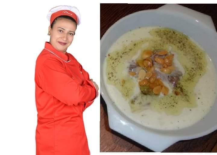 في اناء على نار متوسطةضع ٣كيلو اللبن مع خليط مرق اللحم ونقلبهم جيد وننزل بكوب النشا على اللبن ونقلبهم بمضرب سلك حتى يتجانسوا