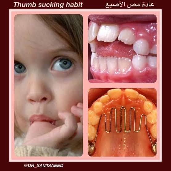 يجب الذهاب لطبيب الأسنان لحل الموضوع بوضع جهاز بسيط يمنع الطفل من وضع أصابعه في فمه.