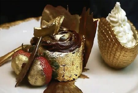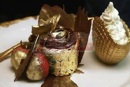 والقطعة محشوة بالزعفران والكمأ الأبيض والفانيليا من مدغشقر ورقائق من الذهب.