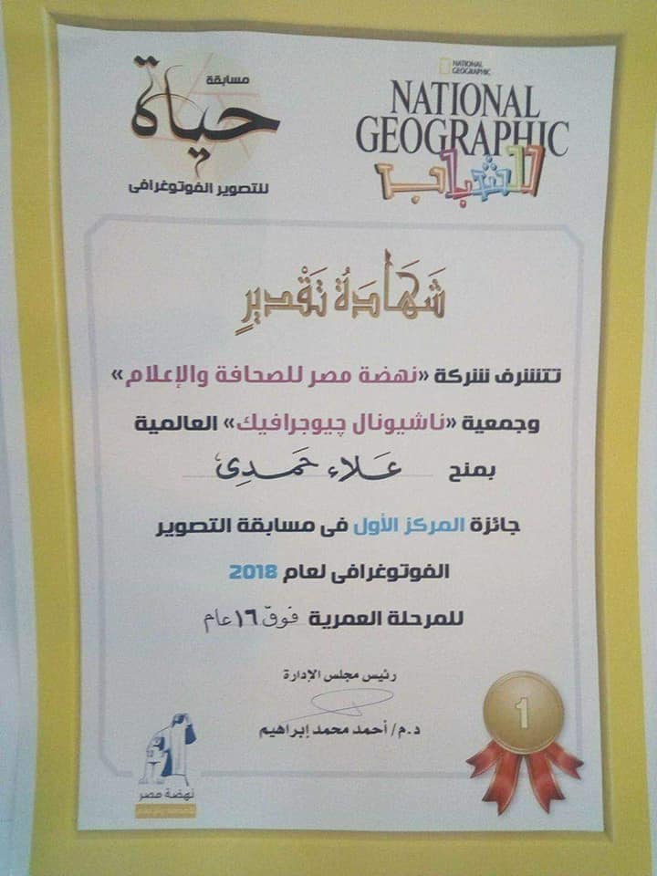 فاز الأستاذ/ علاء حمدي عبده - بالمركز الأول في مسابقة التصوير الفوتوغرافي والتي نظمتها مؤسسة نهضة مصر وجمعية ناشيونال جيوجرافيك العالمية حيث نظمت مؤسسة " نهضة مصر للصحافة والإعلام " حفلا لتوزيع جوائز مسابقة التصوير الفوتوغرافي لعام 2018 بالتعاون مع جمعية ناشيونال جيوجرافيك العالمية وذلك يوم الأربعاء الموافق 28/8/2019 فى الساعة السادسة مساء.