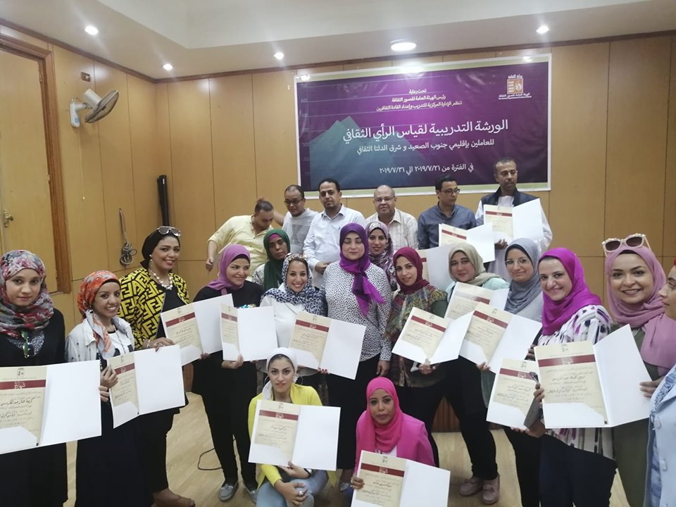 ” قياس الرأي الثقافي " لواحد وعشرين متدرباً من العاملين بإقليم جنوب الصعيد وشرق الدلتا الثقافي بمقر المركزية للتدريب حيث أعربت سيادتها عن سعادتها باجتياز المشاركين للورشة مؤكدة على أن الهدف الرئيسي منها تنمية مهارات وتطوير أداء العاملين وتدريبهم ، وتزويدهم بالمنهج العلمي وإكسابهم الخبرات العلمية والعملية لقياس الرأي الثقافي لدعم التنمية الثقافية بمواقع الهيئة وفقًا لخطة التنمية المستدامة، من خلال مشاركتهم في فريق قياس الرأي الثقافى و تبادل الخبرات والتجارب مع أهل الخبرة والأداء المؤسسي على أمل ان تكون للقصور الثقافة الريادة والابتكار والتميز، في تطوير القدرات وصقل إمكانات العاملين بقصور الثقافة .