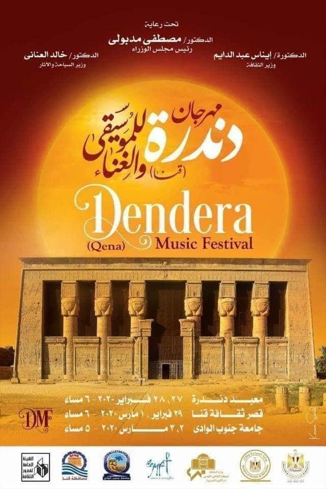 تحت رعاية الدكتور مصطفى مدبولى رئيس مجلس الوزراء والدكتورة ايناس عبدالدايم وزيرة الثقافة والدكتور خالد العنانى وزير السياحة والآثار وفى اطار احتفالات محافظة قنا بعيدها القومى صرح اللواء اشرف الداودى محافظ الإقليم ان المحافظة بالتعاون مع وزارتىّ الثقافة والسياحة والآثار سوف ينظموا مهرجان دندرة للموسيقى والغناء ( قنا ) خلال الفترة من ٢٧ فبراير الى ٣ مارس ٢٠٢٠ فى كل من ( معبد دندرة - قصر ثقافة قنا - جامعة جنوب الوادى ) .