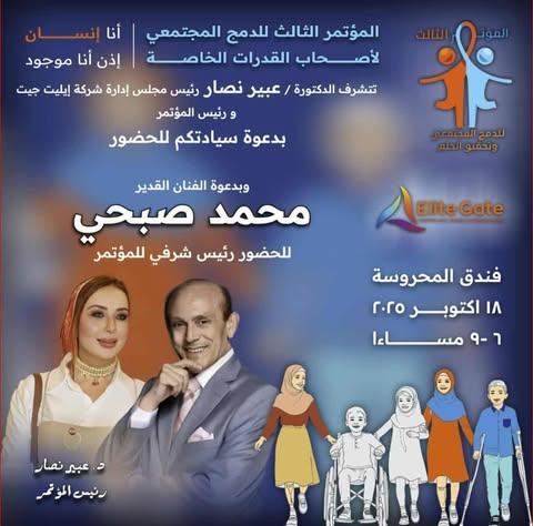 تنطلق غدا مساء السبت الموافق 18 أكتوبر الجاري فعاليات المؤتمر الثالث للدمج المجتمعي لأصحاب القدرات الخاصة، والذي تنظمه شركة إيليت جيت للتدريب والتأهيل والتنمية البشرية برئاسة ورعاية الدكتورة عبير نصار، رئيس المؤتمر، وبمشاركة وحضور الفنان القدير محمد صبحي الرئيس الشرفي للمؤتمر ، وتقام الفعاليات في فندق المحروسه بمحافظة الإسكندرية