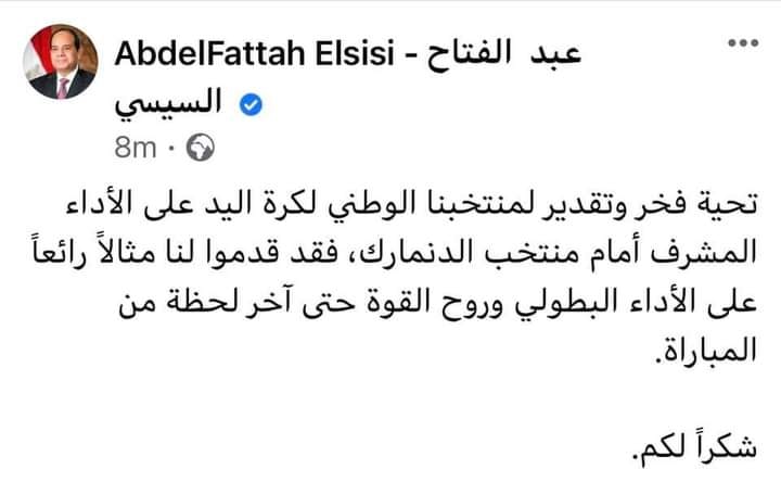 نشر الرئيس السيسى عبر صفحته الرسمية الفيسبوك مشيدا باداء منتخبنا الوطنى قائلا :