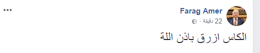 كتب سعيد شفيق كتب المهندس فرج عامر على صفحته عبر مواقع التواصل الاجتماعى ( فيس بوك ) الكأس أزرق باذن الله وذلك قبل لقاء فريقه المرتقب أمام الزمالك يوم الثلاثاء القادم فى نهائى كأس مصر يذكر ان فرج عامر رفض نهائيا أن يدير اللقاء طاقم تحكيم مصرى وطالب بإستقدام حكام أجانب للقاء