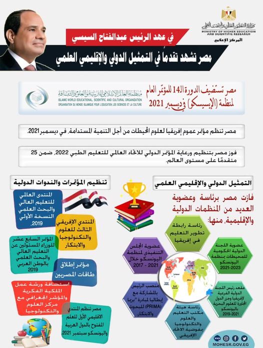 وأوضح التقرير أنه من المتوقع أن تستضيف مصر خلال شهر سبتمبر 2021، المنتدى الإقليمي الأول للعلم المفتوح في الدول العربية بالتعاون مع منظمة اليونسكو، كما ستستضيف مصر الدورة الـ14 للمؤتمر العام لمنظمة (الإيسيسكو)، كما ستنظم مصر مؤتمر عموم إفريقيا لعلوم المحيطات من أجل التنمية المستدامة، المقرر عقده خلال الفترة من 7 حتى 9 ديسمبر 2021.