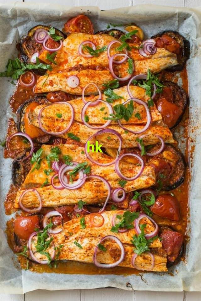 5. ضعي شرائح فيليه فى التتبيلة واخلطي جيدا. .6. اخلطي الخضار والليمون والكزبرة في التتبيلة ، وضعيها مع شرائح الفيليه. 7 ثم نقوم بترتيب شرائح الفيلية على الخضار مع وضع شرائح البصل على الوجة