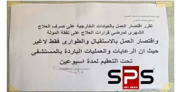 وأعلنت المستشفى انه تقرر إقتصار العمل بالعيادات الخارجية، على صرف العلاج الشهري لمرضى قرارات العلاج على نفقة الدولة فقط، وإقتصار العمل بقسم الإستقبال والطواريء فقط.