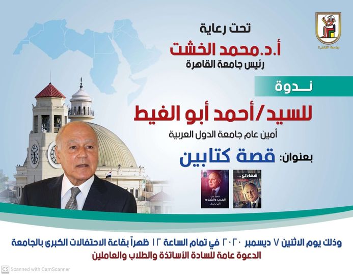 تحت رعاية ا.د/ محمد عثمان الخشت رئيس الجامعة تقيم جامعة القاهرة ندوة بعنوان "قصة كتابين " للسيد احمد ابو الغيط امين عام جامعة الدول العربية بقاعة المؤتمرات الكبرى يوم الاثنين الموافق 7/11/2020 فى تمام الثانية عشر ظهرا والدعوة عامة للسادة اعضاء التدريس والطلاب والعاملين