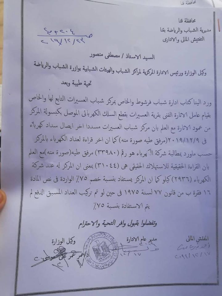 استغاث العاملين بمركز شباب العسيرات شمال قنا بالسيد وزيرالكهرباء ووزيرالشباب والرياضه والسيداللواء محافظ قنا بشان قطع التيار الكهربائي عن مركز شباب العسيرات التابع لاداره شباب فرشوط شمال قنا وذلك بعدقيام عامل الاناره الفني بقطع السلك الكهربائي الموصل بكبسوله مركز الشباب من عامودالكهرباء في حين ان مركز الشباب قام بسداد اخرفاتوره استهلاك بتاريخ 2019/12/9