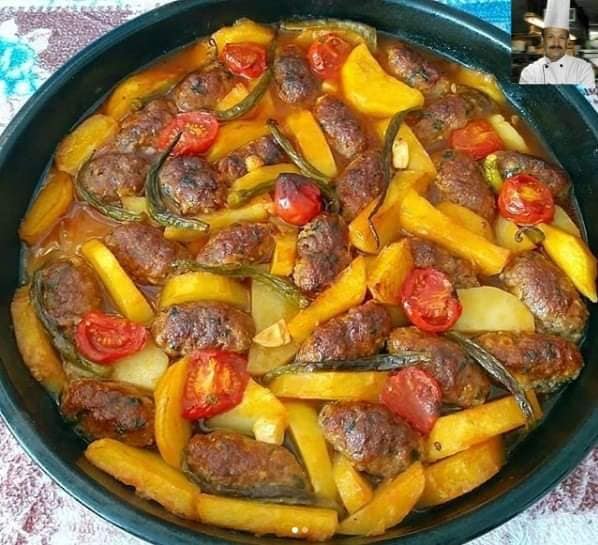 حسين مدة التحضير25 دقيقة ومدة الطهى40دقيقة المقادير - لحم كفتة : 500 جراماً - ملح : ملعقة صغيرة - فلفل أسود : ملعقة صغيرة - 2 حبة البطاطس :مقطعة - طماطم : مقطعة - ملح : ربع ملعقة صغيرة - فلفل أسود : ربع ملعقة صغيرة فلفل اخضر ثوم مقطع طريقة التحضير 1. ضعي لحم الكفتة بطبق الخلط، نكهي بملعقة صغيرة من الملح والفلفل الأسود، واعجني اللحمة جيداً بالبهارات ثم شكليها 2. نرص الكفتة فى صنية وندخل الفرن لمدة20 دقيقة ثم نرص البطاطس والفلفل، والطماطم. 3.ثم نرشي الوجه بربع ملعقة صغيرة من الملح والفلفل الأسود. 4-أدخلي الصينية للفرن حتى تتحمر مدة20 دقيقة على درجة حرارة 200. . قدميها ساخنة.والف هنا