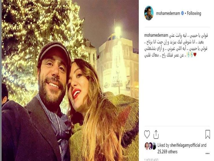 وظهر إمام رفقة زوجته في لقطة رومانسية، وأغلق خاصية التعليقات وكتب مطلع أغنية "معاك قلبي" للمطرب عمرو دياب: " قولي يا حبيبي.. ليه وانت عني بعيد.. أنا شوقي ليك بيزيد وإن جيت أنا برتاح.. قولي يا حبيبي.. إيه اللي غيرني.. و إزاي بتشغلني عن عمر قبلك راح.. معاك قلبي". يُذكر أن الفنان محمد عادل إمام يستعد للسباق الدرامي لرمضان المُقبل بمسلسله الجديد "هوجان"، ويشاركه البطولة كريم محمود عبدالعزيز، ومحمد أسامة "أوس أوس"، محمد عبدالرحمن "توتا"، ومن تأليف محمد صلاح العزب وإخراج شيرين عادل.