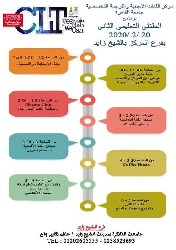ينظم مركز اللغات والترجمة بجامعة القاهرة، تحت رعاية الدكتور محمد عثمان الخشت رئيس الجامعة، الملتقى التعليمي الثاني بفرع المركز بمدينة الشيخ زايد، يوم الخميس المقبل 20 فبراير الجاري، وذلك لعرض دورات وأنشطة المركز، وتقديم ورش تدريبية مجانية للطلاب في مجال تعلم اللغات.