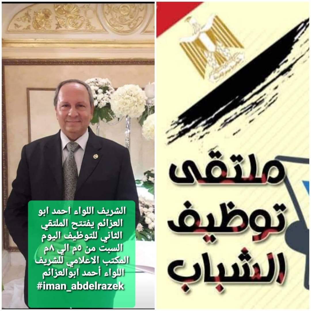 من سن ٢٠سنة حتى ٤٠سنة فورا بمرتب ٢٥٠٠جنية أمن المنطقة السياحية بشارع المعز لدين الله الفاطمى العمل ٨ساعات والشغل ٣ ورادى ويوم اجازة اسبوعى وبعد ٦شهور شغل له اجازة سنوية ٢١يوم ولة تأمينات اجتماعية وتأمينات صحية غير مخصومة من المرتب وبيتم تسليمهم يونيفورم مجانى ومن جانبه صرح اللواء احمد ابوالعزائم رئيس مؤسسه ابو العزائم للتنميه ان تنظيم هذا الملتقى يأتى فى اطار توجه الدوله بتفعيل دور مؤسسات المجتمع المدنى ذات والوحدات ذات الطابع الخاص فى مساهمتها الفاعله للمشاركه المجتمعيه وتدعيما لدور تلك المؤسسات فى مواجهه قضايا الوطن لاسيما تشغيل الشباب للحد من البطاله واضاف اللواء ابو العزائم ان المشاركه المجتمعيه الفاعله تأتى فى اطار تحقيق استاراتيجه مصر ٢٠/٣٠..حفظ الله مصر شعبا ورئيسا وجيشا وشرطة وحفظ الله الأمة العربية والإسلامية والإنسانية جميعا للتواصل مع المكتب الإعلامى للمؤسسة بالقاهرة 01102023456