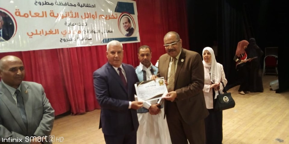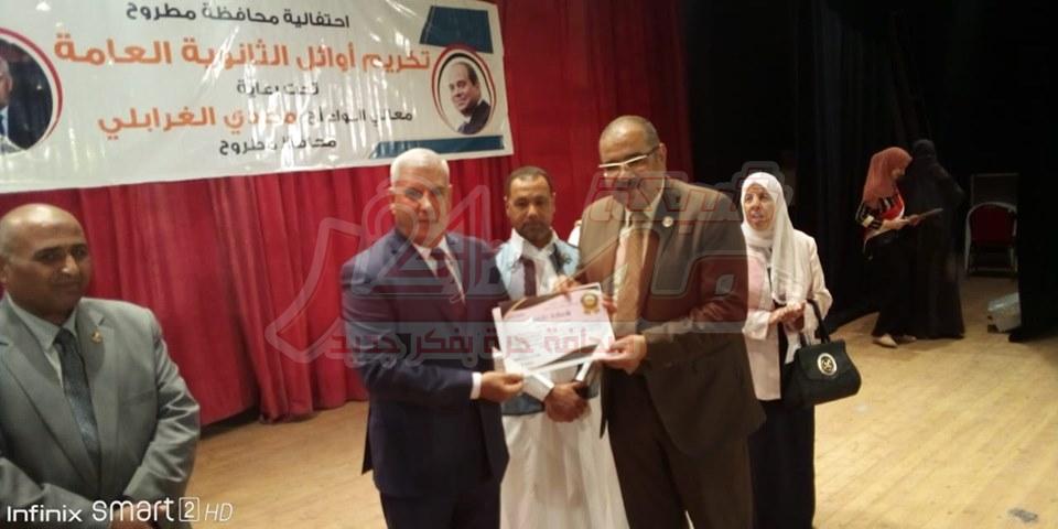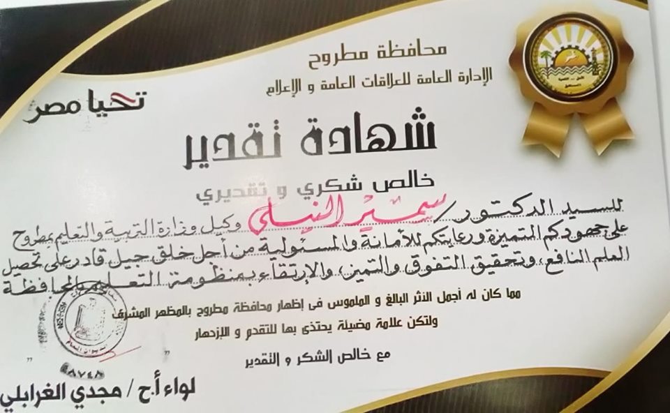 وجاء التكريم من السيد المحافظ تقديرا للجهد المتميز والأداء الفعال والدور الواضح في تحديث العملية التعليمية بمدارس مطروح وارتفاع المستوي التعليمي لطلاب الثانوية العامة وتحقيق نتائج متميزة مع ارتفاع نسب المجاميع المرتفعة بشكل غير مسبوق
