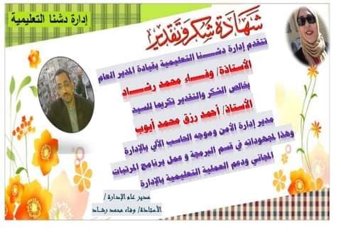 كرمت السيدة وفاء رشاد مدير عام الادارة كلا من الاستاذ احمدرزق وشاذلى عطا وابراهيم الغريب أعضاء قسم الحاسب الالى بالادارة لتصميمهم برنامج المرتبات المجانى الجديد