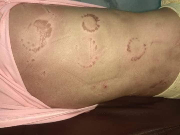الداخلية، ثم تطلب مني تشطيب المطبخ وترتيب البيت، وحمل أخي الصغير ومداعبته حتى لا يبكي، ثم تقوم بتعذيبي بالكي وضربي بالخرطوم والشبشب، إذا قلت لها إني متعبة أو غير قادرة على تشطيب المطبخ، لأني تعبت من حمل ابنها الصغير الذي كان لا يكف عن البكاء، فتضربني كلما بكى قائلة احمليه حتى يسكت.