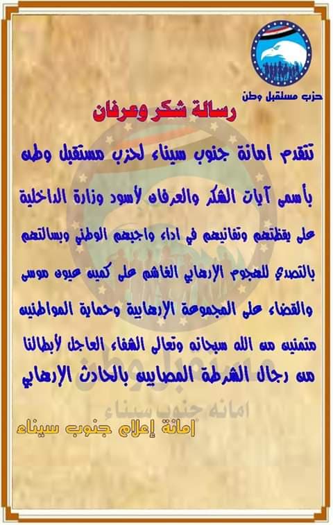 اثني حزب مستقبل وطن بمحافظة جنوب سيناء برئاسة جيفارا محمد الجافي علي يقظة و ثبات رجال الشرطة المصريه والقوات المسلحه و علي الجهود المبذولة، من أجل محاصرة العناصر الإرهابية وقتل اتنين منهم قبل تنفيذ مخططاتهم الإرهابية، علي التمركز الامني ، كمين عيون موسي صباح اليوم ،