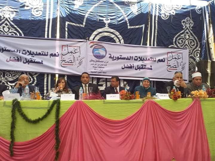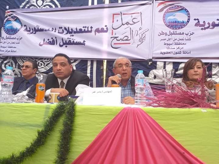عقد صباح الثلاثاء مؤتمر جماهيرى بالوحدة المحلية بأولاد إلياس بمركز صدفا،وذلك لدعم التعديلات الدستورية بحضور النائب ياسر عمر امين عام حزب مستقبل وطن بأسيوط والنائبة اليزابيث شاكر عضو مجلس الشعب والنائبة سهير الحادى والنائب ممتاز دسوقى عضو مجلس الشعب عن دائرتى صدفا والغنايم والاستاذ محمد فهمى صالح رئيس المجلس الشعبى المحلى سابقا وابن قريه اولاد الياس والاستاذ محمود زين امين مساعد الحزب والاستاذ يونس درويش امين الاعلام بالمحافظة واشرف لمعي امين المجالس المحلية ،وبحضور امين الحزب بصدفا وامين التنظيم وباقى اعضاء هيئه المكتب ولفيف من القيادات الشعبيه والتنفيذية بالمركز، وعلى رأسهم الاستاذ حسين كشك رئيس مركز ومدينة صدفا وفرغلي محمد رئيس الوحده المحليه باولاد الياس ورموز العائلات بالمركز وحشد كبير من المواطنين.