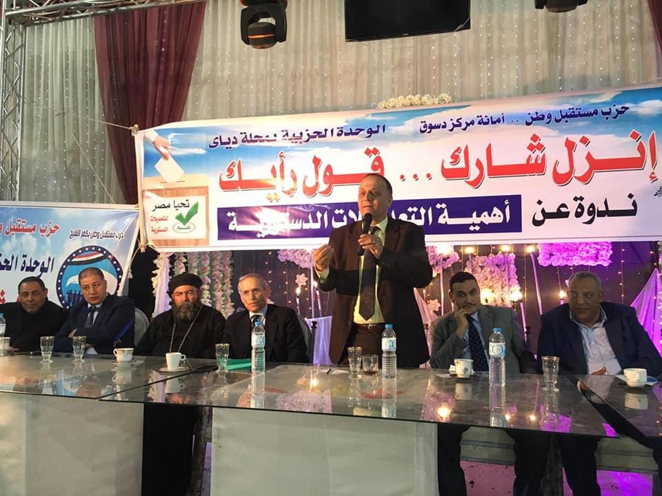 حيث تم شرح التعديلات الدستورية والتأكيد على أهمية الحشد للاستفتاء بالإضافة إلى استعراض الانجازات التى تحققت خلال السنوات الاخيرة و الندوة الثانية نظمتها أمانة مركز دسوق بقرية محلة دياي بحضور النائب عبدالحميد دمرداش والمحاسب أحمد جعفر والقمص يونان لبيب راعى كنيسة كفرالخير والمهندس حسن الطراوى امين التقييم والمتابعة بالمحافظة والمهندس عادل النجار امين الحزب بمركز دسوق وعادل حسنين أمين الحزب بمدينة دسوق وعدد كبير من الاهالى وشدد المتحدثون على أهمية التعديلات الدستورية لعبور هذه المرحلة والحفاظ على استقرار البلاد والندوة الثالثة أقيمت بقرية السالمية أمانة مركز فوة بحضور عصام الخطيب امين الحزب بالمركز وفؤاد الرفاعى رئيس نادى بلطيم وياسين متولى المحامى الأمين المساعد للعمل الجماهيرى بالمحافظة وعدد من رجال الأزهر والكنيسة والرابعة نظمتها امانة سيدى سالم .