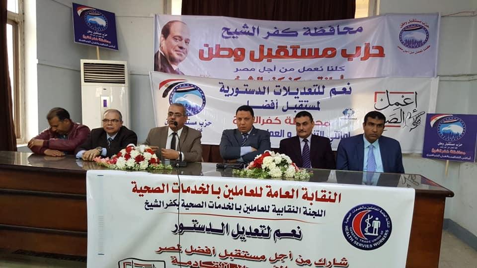 واصل حزب مستقبل وطن برئاسة المهندسن أشرف رشاد الشريف بمحافظة كفرالشيخ تنظيم المؤتمرات و الندوات المكثفة للتوعية بالتعديلات الدستورية والدعوة للحشد بالمراكز والمدن قبل التوقف استعدادا للاستفتاء المقبل حيث عقد مؤتمران كبيران بكل من بيلا وبلطيم بحضور اكثر من ٧ آلاف مواطن فى المؤتمرين بالتنسيق مع التعاونيات والإصلاح الزراعى و مديرية الزراعة بكفرالشيخ واهالى مركزي بلطيم وبيلا بحضور المهندس فوزى الرفاعى امين عام الحزب بالمحافظة والمحاسب أحمد جعفر الأمين العام المساعد والسيد نصر امين العمال بالحزب على مستوى الجمهورية ومجدى الشراكى امين العمال بالحزب بالمحافظة والمهندس حسن الفولى نائب وزيرالزراعة رئيس الهيئة العامة للإصلاح الزراعى والمهندس محمد عبدالله وكيل وزارة الزراعة بكفرالشيخ وأحمد كمال عطية عصام امين الحزب بالبرلس و عصام عبدالغفار عضو مجلس الشعب السابق وعزة الدعدر أمينة المرأة بالبرلس ووليد زيتون الأمين المساعد لقطاع الاعمال واكد الحضور على أهمية الحشد فى الاستفتاء على التعديلات الدستورية لتحقيق الاستقرار الوطنى والمعيشى والحفاظ على الانجازات والمكتسبات إلتى تحققت فى عهد الرئيس عبدالفتاح السيسى بالإضافة إلى استكمال المشروعات القائمة وتحقيق طموحات المصريين فى جميع المجالات وعلى صعيد الندوات عقدت ندوة بقاعة الشعب بمركز الدراسات الوطنية بمدينة كفرالشيخ بالتعاون مع مديرية الصحة بحضور الدكتور على ابوشوشة الأمين العام المساعد للحزب بالمحافظة والدكتور ياسر الجندى امين السياسات والدكتور مايكل مكرم امين المواطنة والدكتور ياسرشحاتة امين العمل الجماهيرى والدكتور بطرس يوسف الأمين المساعد للعمل الجماهيرى والدكتور فيصل جوده وكيل وزارة الصحة بالمحافظة وتحدث الحضور عن التعديلات الدستورية واهمية المشاركة بالرأي فى الاستفتاء كما أقيمت ندوة أخرى بمركز كفرالشيخ بحضور مايسة عبدالجواد أمينة الفلاحين ومجدى عباس النجار امين الحزب بالمركز وتحدثت الندوة عن اهمية الحشد للتعديلات وفى مركز بيلا أقيمت ندوة صغرى بحضور جمال الصيرفى امين الحزب بالمركز وعدد من قيادات الحزب حيث تم شرح التعديلات الدستورية والدعوة للحشد فى الاستفتاء لتحقيق الاستقرار واستكمال المشروعات وياتى ذلك فى إطار خطة الامانة العامة المركزية للحزب على مستوى الجمهورية الداعمة للتعديلات الدستورية والدعوة للحشد فى الاستفتاء.